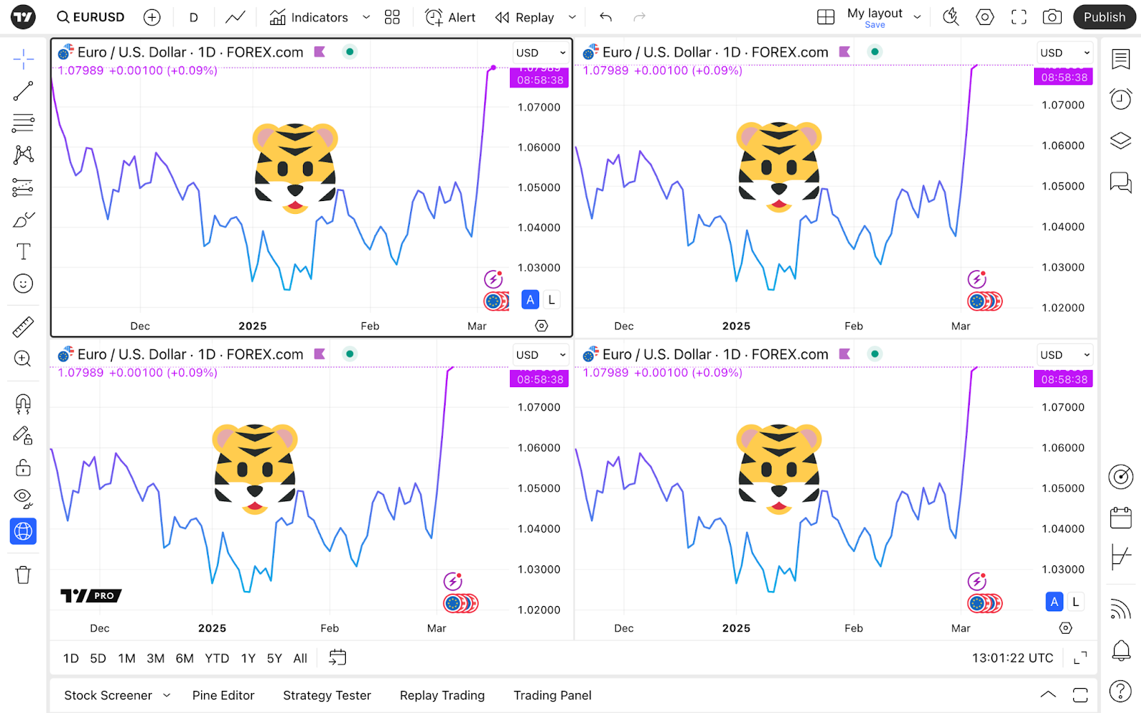תכונה מרכזית נוספת של סופר-גרפים של TradingView היא פריסות מרובות הגרפים שלה, שתוכל למצוא בהגדרת פריסה. מצב זה מאפשר לך לקבל גרפים מרובים בסביבת העבודה שלך כדי למקסם את הניתוח שלך.