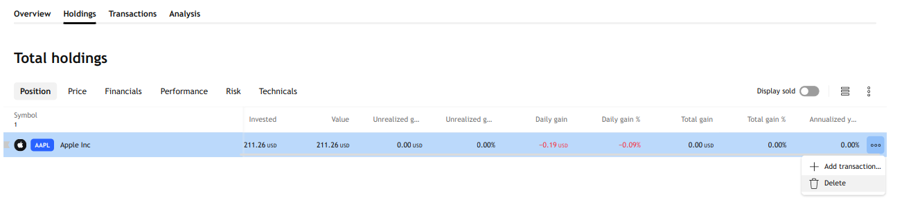 - בחר את סוג העסקה הרצוי — עסקאות, מזומן או דיבידנדים.