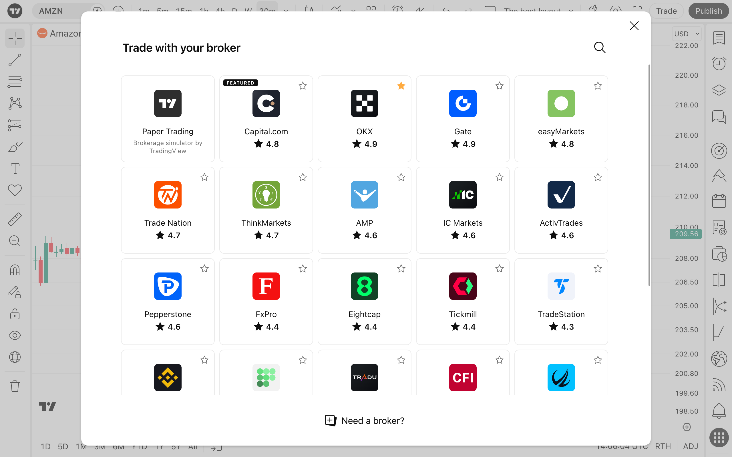 לאחר מכן ייפתח חלון שבו תראו את רשימת הברוקרים המהימנים שלנו — כל אחד מהם מורשה ומאומת. אם תרצו לבחון את היכולות שלכם או לבדוק אסטרטגיה חדשה, תוכלו להשתמש במסחר בנייר ללא סיכון.