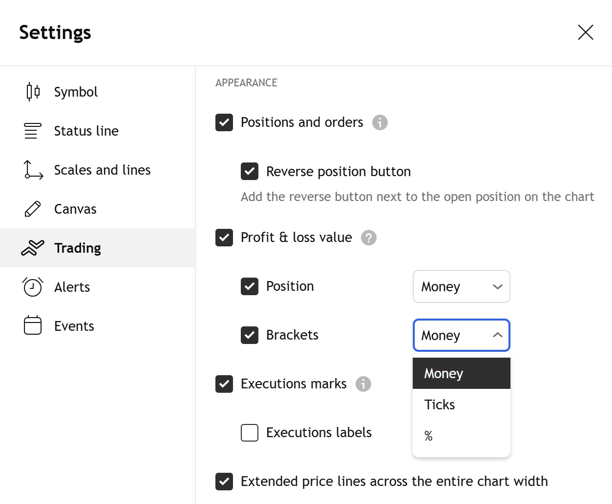 ניתן להתאים אישית את האופן שבו רווח והפסד (PnL) מוצגים על הגרף בהגדרות המסחר שלך: