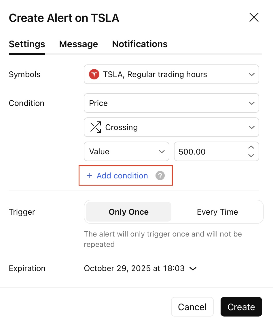 צור התראות שבודקות מספר תנאים בו־זמנית — איתותים חכמים ומדויקים יותר, ללא כתיבת שורת קוד אחת. עם הפיצ’ר הזה, ניתן לשלב עד חמישה תנאים שונים — כולל מחיר, שרטוטים ואינדיקטורים להתראה אחת וחזקה. ההתראה תופעל רק כאשר כל התנאים מתקיימים בו־זמנית.