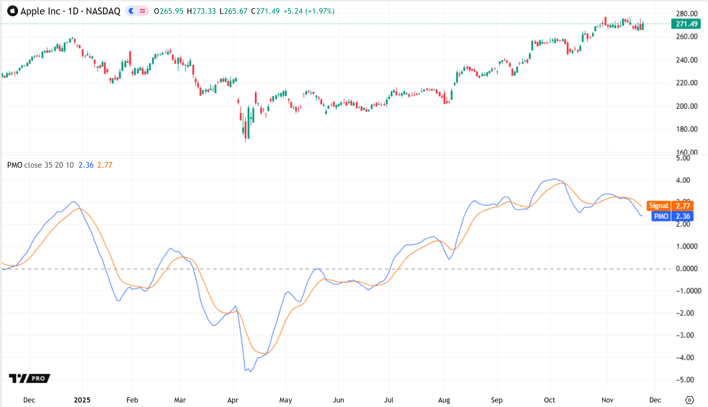 - ערכי PMO מעל 0 מצביעים על מומנטום ממוצע כלפי מעלה. ערכים מתחת ל-0 מצביעים על מומנטום ממוצע כלפי מטה.