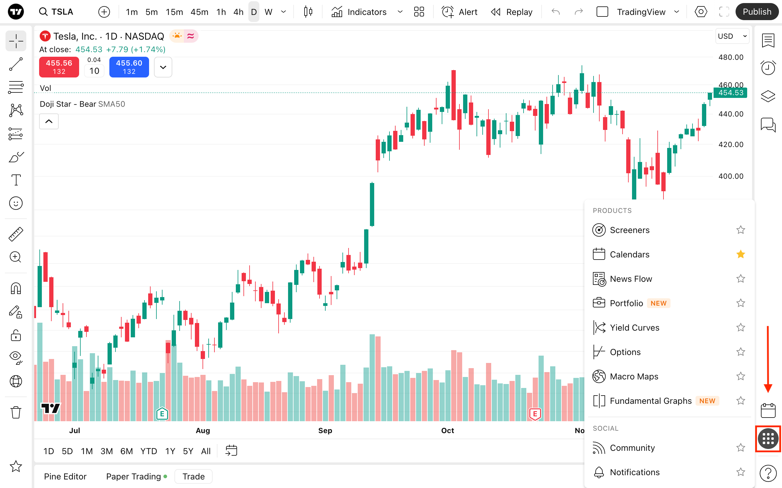 לחלופין, תוכל ל השתמש בגיליון השכבה הזמין בכל דף TradingView גם בזמן יצירת גרף. לחץ על תפריט מוצרים בסרגל הכלים הימני ובחר לוחות שנה.