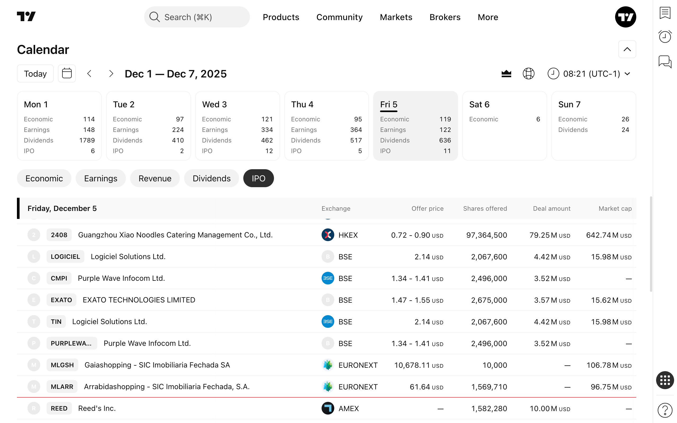 לוח השנה של הנפקות ראשוניות, שהוא חלק מלוחות השנה של TradingView עוזר לך לתכנן את העסקאות וההשקעות שלך. הוא מאפשר לך לצפות בהנפקות ראשוניות עתידיות ולעקוב אחר הנפקות ראשוניות קודמות, עם גישה לדוחות החברה ומידע מפורט על כל רישום.