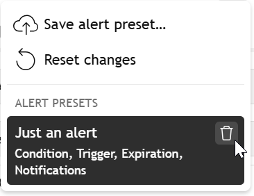 מהן הגדרות התראות קבועות מראש ?הגדרת התראות מוגדרות מראש/תבניות התראות מאפשרות לך לשמור את הגדרות ההתראה שלך כתבניות, ולהחיל אותן במהירות על סימולים או תנאים שונים. במקום להגדיר בכל פעם מחדש את אותם פרמטרים של התראה באופן ידני, ניתן ליצור תבנית פעם אחת ולהשתמש בה שוב בלחיצה אחת.