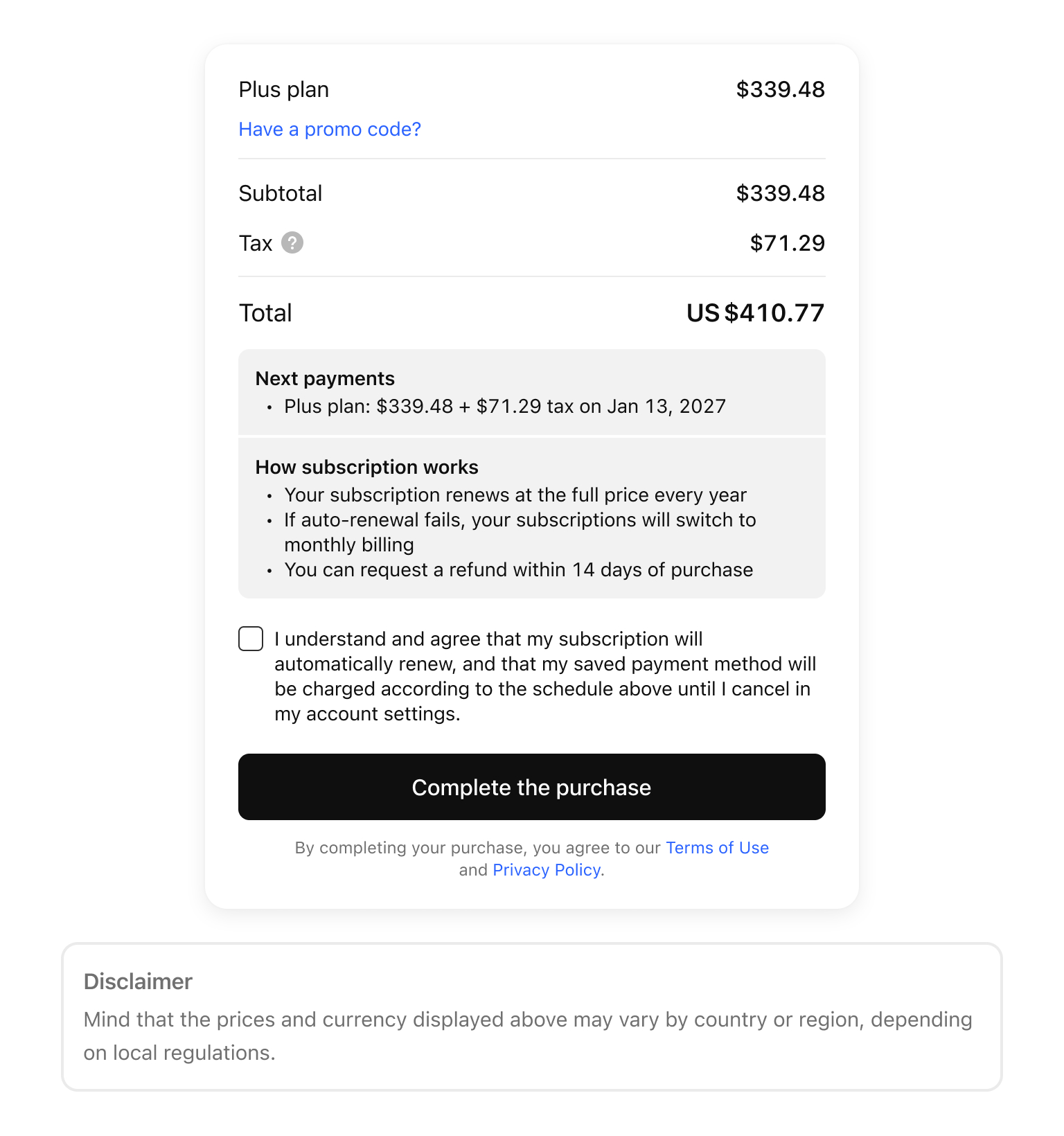 לאחר שתבחר את המנוי, תועבר ישירות לעמוד התשלום כדי להשלים את הרכישה.