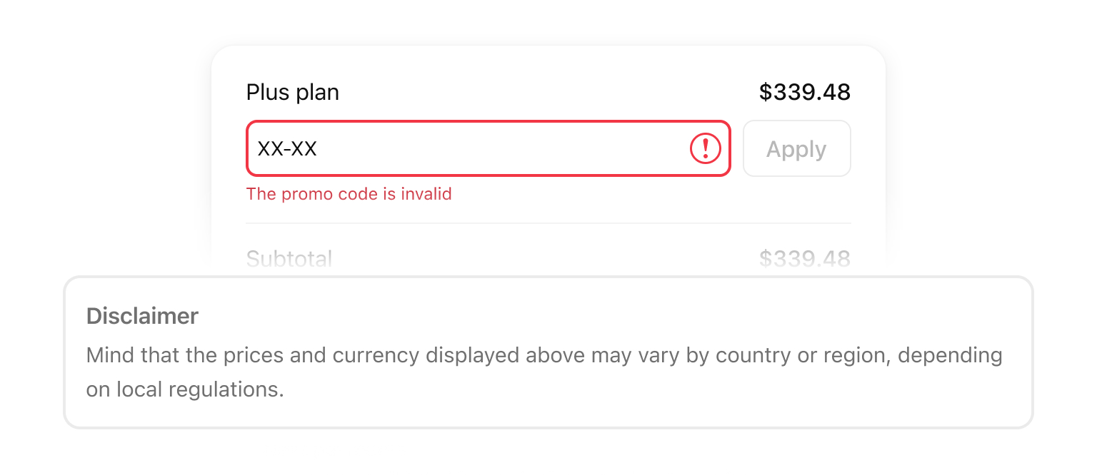 "הקוד אינו תקף". שגיאה זו מופיעה אם הקופון פג תוקף, אינו תואם לתוכנית שבסל שלך, או שאינו תקף למדינה הספציפית שלך. אנא בדוק את תנאי הקופון. אם לדעתך הכול נכון אך הקופון לא עובד, פנה לצוות התמיכה שלנו.